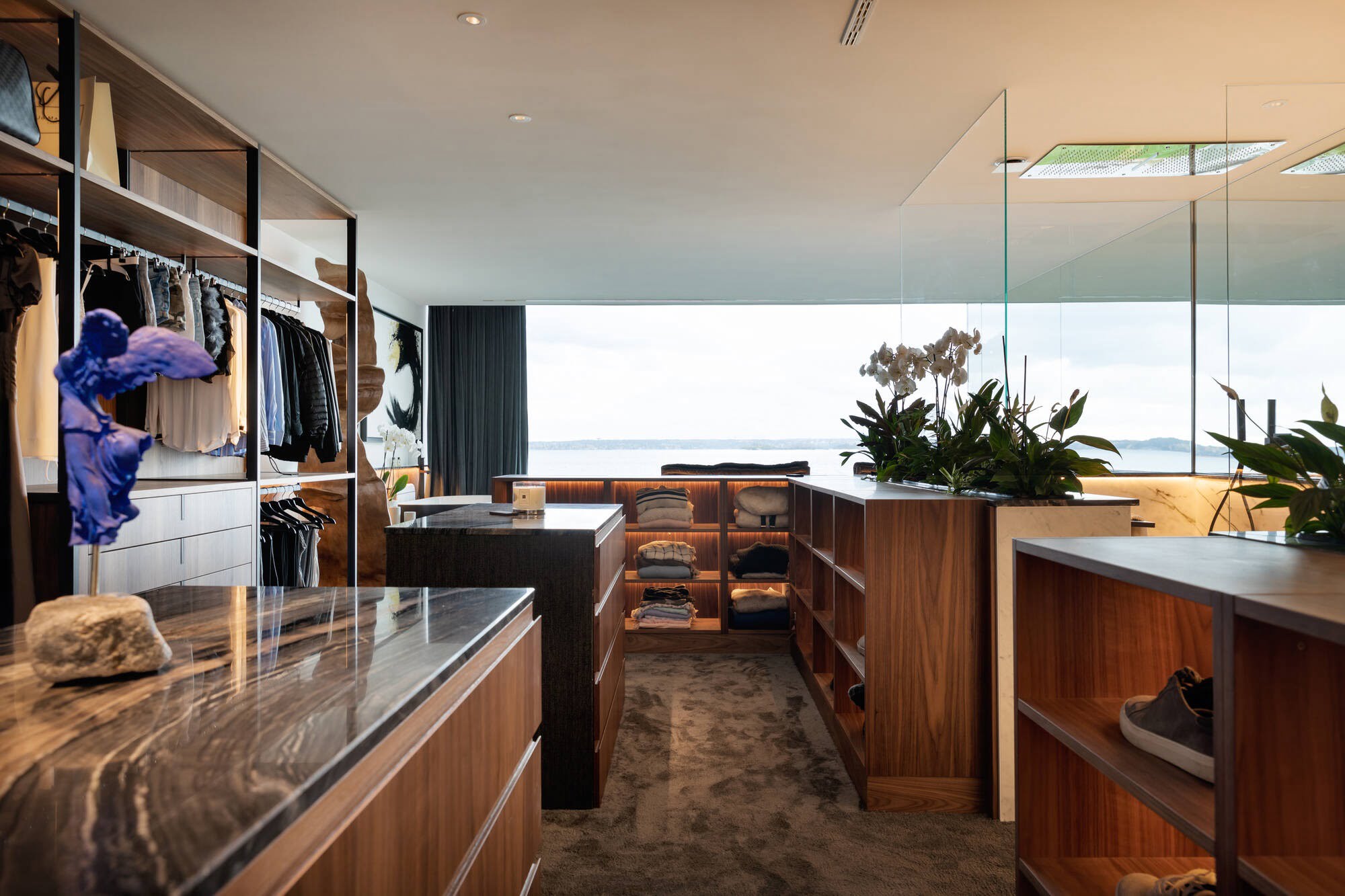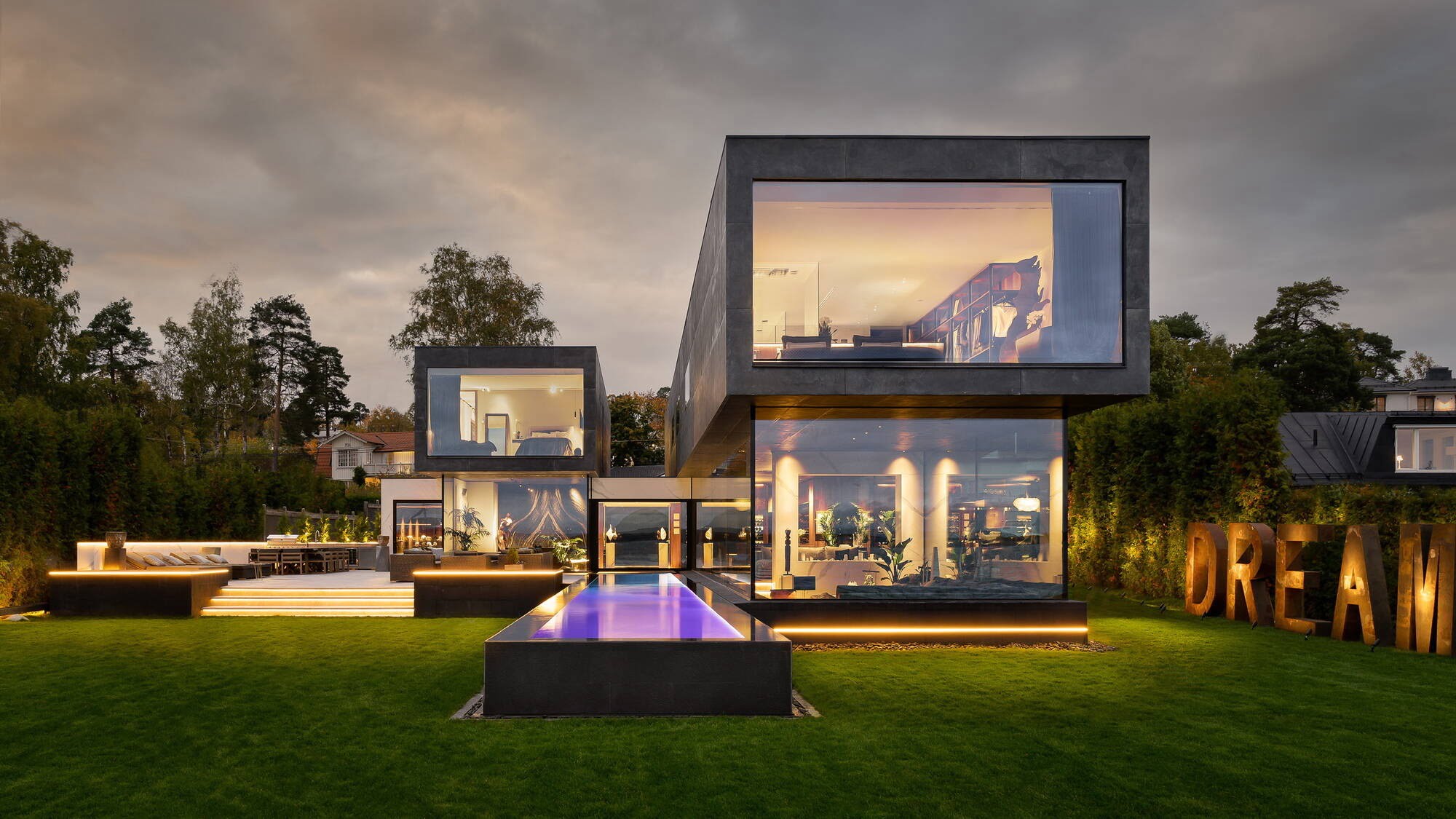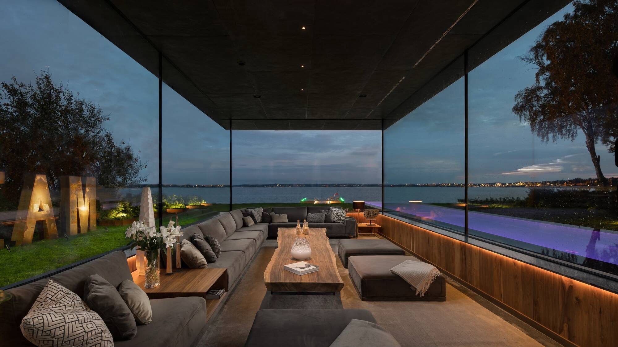 I annonsen står det att man ”hämtat de mest exklusiva byggmaterial från alla kontinenter” och i detta material ingår en hel del glas och marmor, även sovrum och badrum har enorma fönster som gjorda för en bra utsikt (eller möjligen insikt).